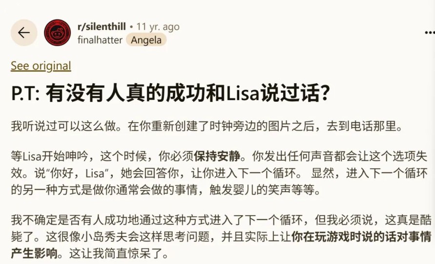 图 / Reddit平台上关于女鬼Lisa设计的评论(汉化版)。据说,在不断大叫“Hello,Lisa”过程中,最后出现的丽萨大脸,惊悚程度绝对能够终身难忘。感兴趣的朋友欢迎自己搜索,后果自负。